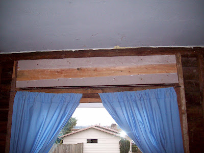 Front bedroom east window slightly different treatment: remove short vertical 2x4s above original header, clip nails, chainsaw full length studs either side window to header support length. Had planned two rough cut 2x12s garage work bench salvage header but realize (unlike reported last time) walls are 3.5 inches thick, won't allow double full two inch thick 2x12 header. Hugely strong 2x12 eight feet long, fits just right atop support studs either side window, between next stud over both sides window. Multi nail 5/8x12 plywood strengthener to header, end nail through full length studs either end: could safely drive Mack truck over that window now.